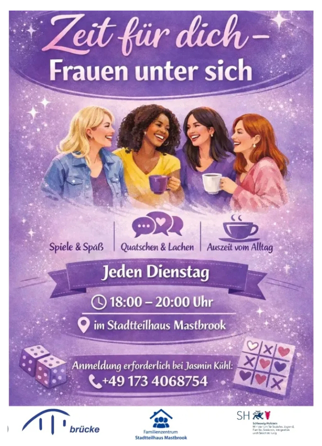 Unter dem Motto „Frauen unter sich“ lädt die neue Frauengruppe im Stadtteilhaus Mastbrook zu einer Auszeit vom Alltag ein. Geplant ist der "Austausch, Lachen und gemeinsame schöne Momente". Treffen jeden Dienstag von 18:00 bis 20:00 Uhr im Stadtteilhaus Mastbrook. Interessierte melden sich bei unserer Kollegin Jasmin an. Kontakt: Jasmin Kühl (Anmeldung erbeten), Tel.: 0173.40 68 754