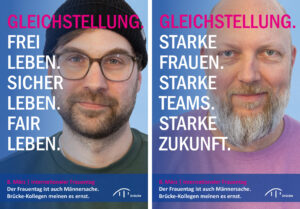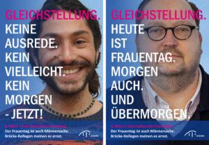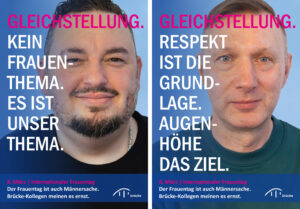 Anlässlich des Internationalen Frauentags (8. März) engagieren sich zahlreiche männliche Mitarbeiter der Brücke mit einer gemeinsamen Poster-Aktion und klaren Botschaften für Gleichberechtigung und Respekt im Arbeitsleben und in der Gesellschaft. Mit ihrer Aktion drücken die Kollegen ihre Solidarität mit Frauen aus und machen zugleich darauf aufmerksam, dass echte Gleichberechtigung noch nicht erreicht ist.